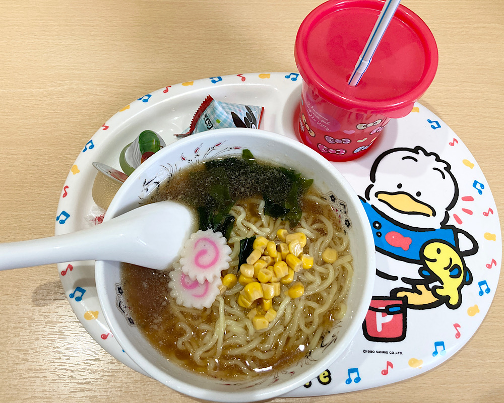 ラーメンのほかに、ゼリー2個、チーズ2個、選べるジュース、お菓子の小袋がついてきて息子も嬉しそうです。