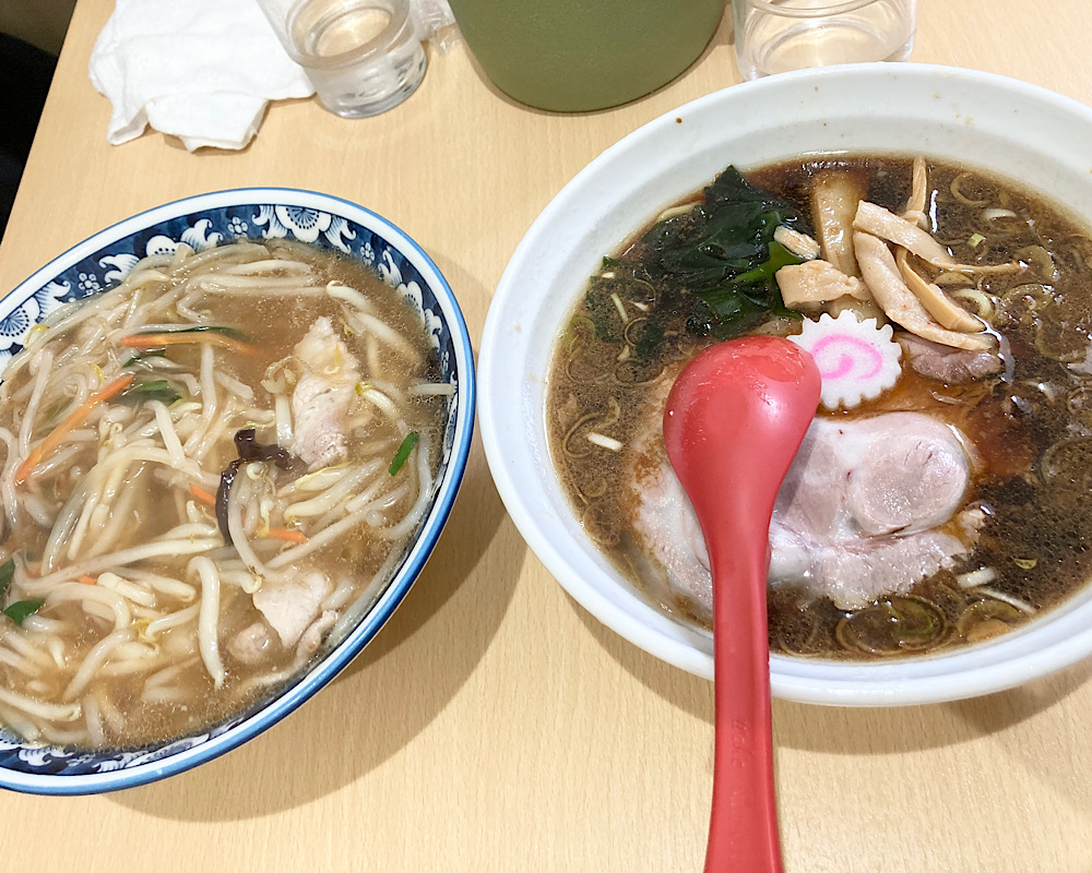 こちらは左がもやしラーメン、右が黒醤油ラーメンです。